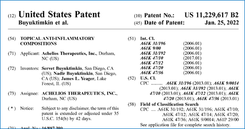 Achelios holds a broad composition patent applicable to drugs in development, specifically ketoprofen, diclofenac, naproxen, and ibuprofen. The composition of the formulation patent relates to a non-irritating topical analgesic for the treatment of various pains, such as nociceptive pain, inflammatory pain, pathological pain, and migraine pain. In addition, the company has received a method-of-use patent for topical ketoprofen, as well as diclofenac, naproxen, and ibuprofen, in the indication of acute and chronic migraine, temporomandibular joint pain and neuropathic pain.